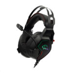 این هدفون همانطورکه گفتیم بصورت اتصال باسیم طراحی شده و در همین راستا با کابلی به طول 2.2 متر و با روکش از جنس کتان و متصل به رابط (USB) می تواند به انواع دستگاه های میزبان متصل گردد، همچنین بهره مندی از فیش 3.5 میلی متری صدا (AUX) از دیگر امکانات ارتباطی هدفون موردنظرمان می باشد، بر روی کابل هدفون کلیدهای تنظیم ولوم صدا، قطع و وصلی صدای میکروفون و از همه مهمتر کلید تنظیم نورپردازی هدفون تعبیه شده است.